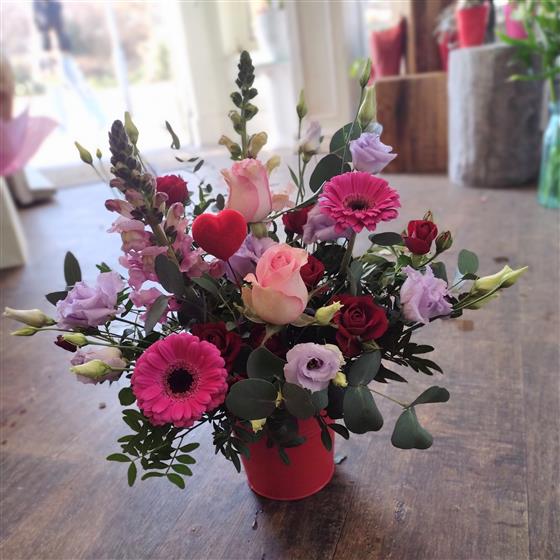 Pretty and Natural arrangement in romantic pinks and reds with complementary foliage. The design is made in floral foam in a container. The design will be professionally gift wrapped. The photo is a sample of medium size.