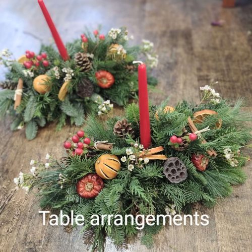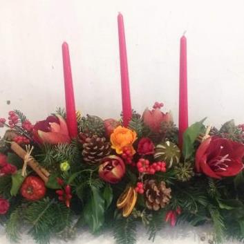 A beautiful Christmassy long and low candle arrangement. Including festive materials such as gold/silver/copper/natural dried materials and fruits.
