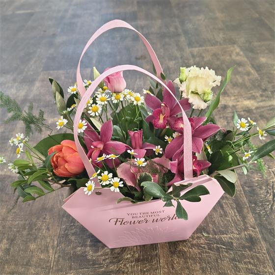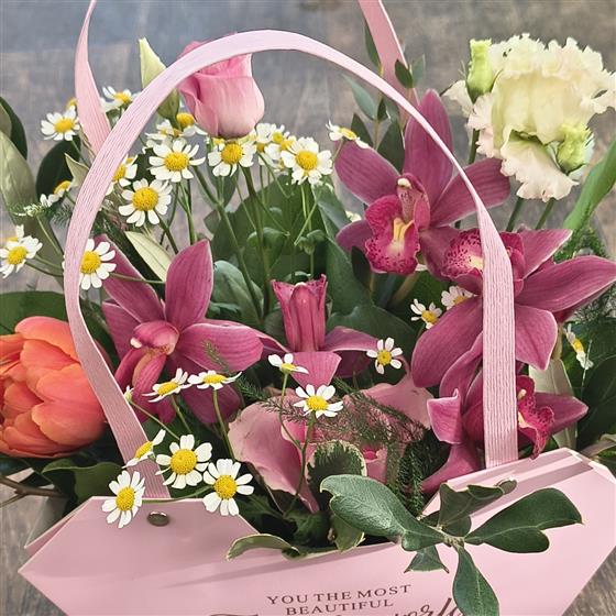 Pretty flower arrangement in bag. Ideal for a present for Mother's day, birthday, anniversary etc.