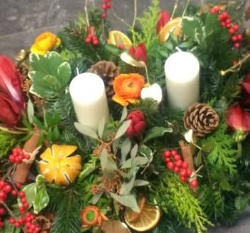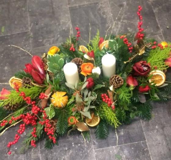 Fantastic festive Christmas long and low design with pillar candle (s).