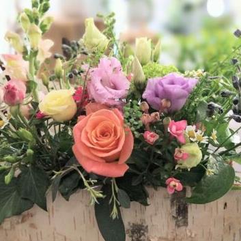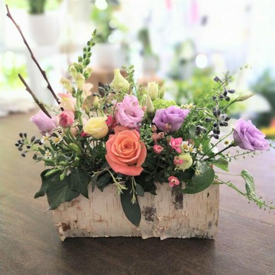 Natural and rustic arrangement in a wooden log, using fresh, seasonal materials.