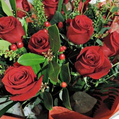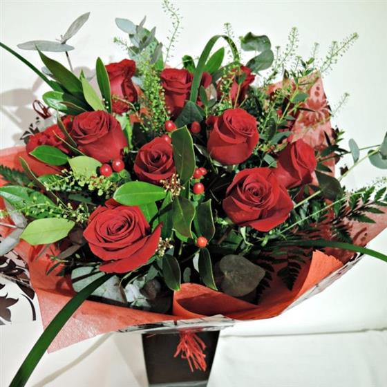 12 beautiful red roses with complementary filler or berries, finished with fresh foliage.