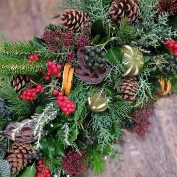 A beautiful table runner or mantlepiece design in floral foam. This is a narrow design so perfect for a busy table on Christmas day. The design does not include flowers but festive fresh foliage and dried materials, making this a long lasting design.