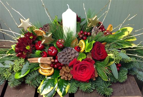 Classic festive arrangement in red and gold with candle. (candle can be dinner candle – pillar candle, depends on the selected size option.) The photo is a sample. Posy design.
