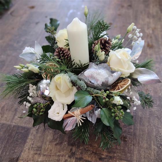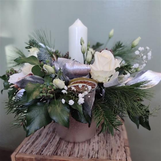 A stunning, classic white arrangement with a candle placed inside a festive container.