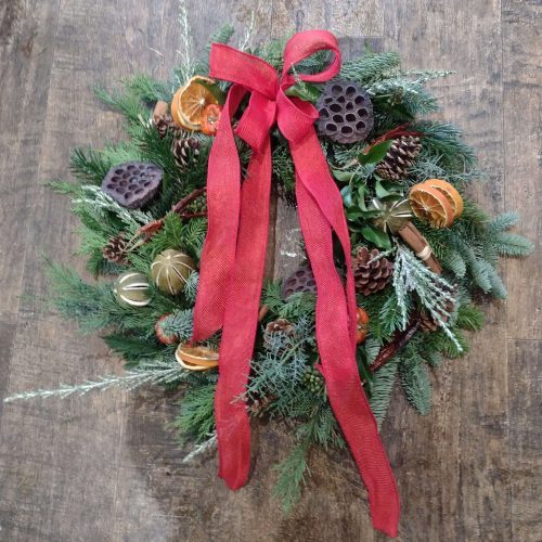 A beautiful traditional Christmas door wreath including dried fruits, pine cones etc.